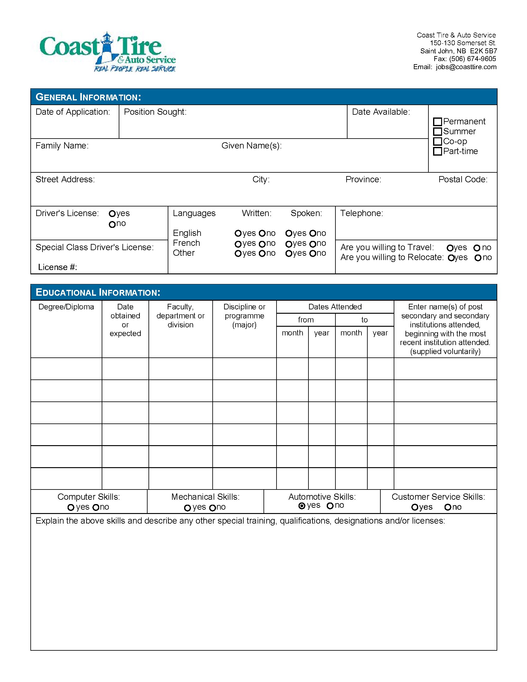 When you apply, please be sure to include an updated copy of your resume, along with a completed application form, which can be accessed by clicking here. If you are applying electronically, we ask that you include your resume as an MS Word document, or plain text file only. If no positions are currently advertised, you can send your resume and completed application form to: Human Resources Coast Tire & Auto Service 130 Somerset St., Suite 150 Saint John, NB E2K 2X4